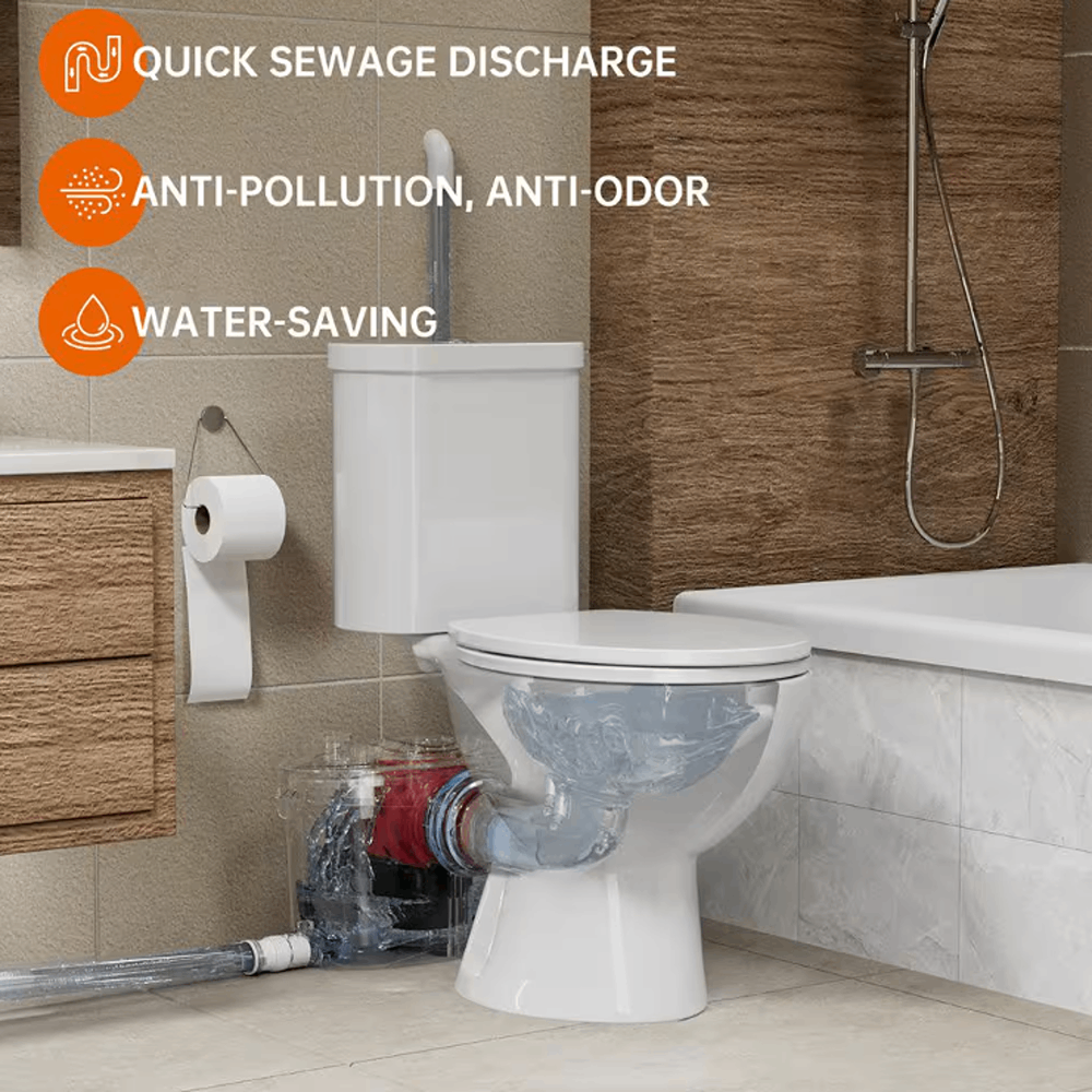 Equipped with a powerful 600-Watt maceration pump, the system is capable of pulverizing solid waste and efficiently pumping it up to 29.5 feet vertically and 295 feet horizontally. This allows for flexible installations even far from the main soil stack. It’s the perfect answer for turning unconventional areas into fully functional bathrooms.